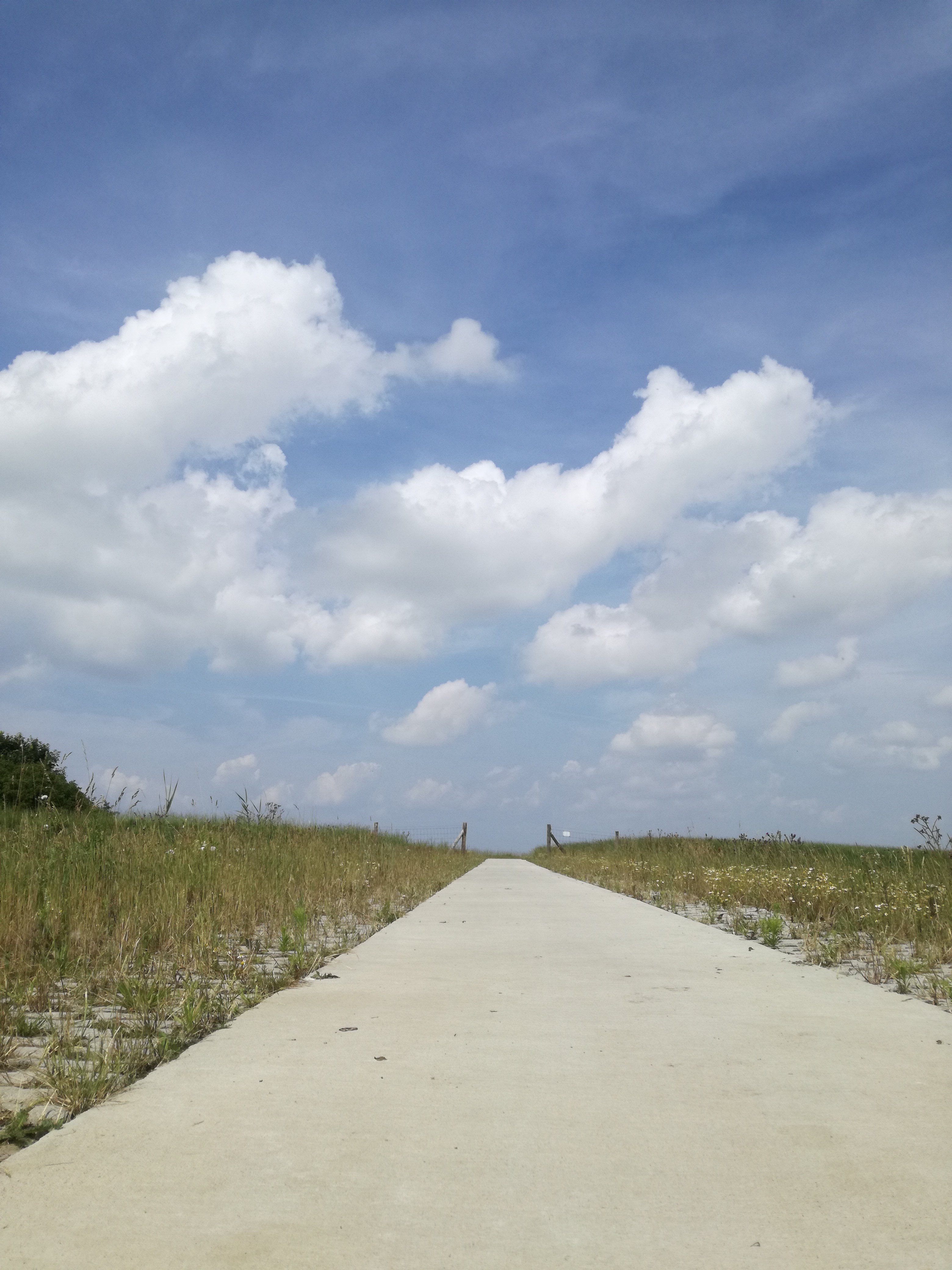 Geweldig om te voelen hoe angst, gedachten, plannen maken in mijn hoofd, dan de overhand nemen. Ken dit gevoel natuurlijk van mijn lange tocht en loop dus tegelijkertijd mijzelf wat uit te lachen. Moet je zien wat je doet in je hoofd… Helemaal uit het hier en nu is Tom Poes een plan aan het verzinnen. Opties genoeg natuurlijk. Naar een boerderij lopen. Een B&B boeken in Termunte, een taxi bellen, liften, een Belbus regelen of toch de ultieme kom-me-redden oplossing. Michiel als backup die een uur door het Groninger land moet scheuren om zijn vrouwtje van een dijk te komen redden. De uiteindelijke verstandige keuze is om het tempo te verhogen door op het fietspad naast de dijk te lopen. Het tempo gaat ook omhoog door geen leespauzes meer te nemen of wat te gaan zitten niksen om in alle stilte van de ruimte en rust te genieten. Het is hier zo stil en leeg dat ik echt al mijn zintuigen kan openzetten om alles volledig in mij op te nemen en er deel van te worden.