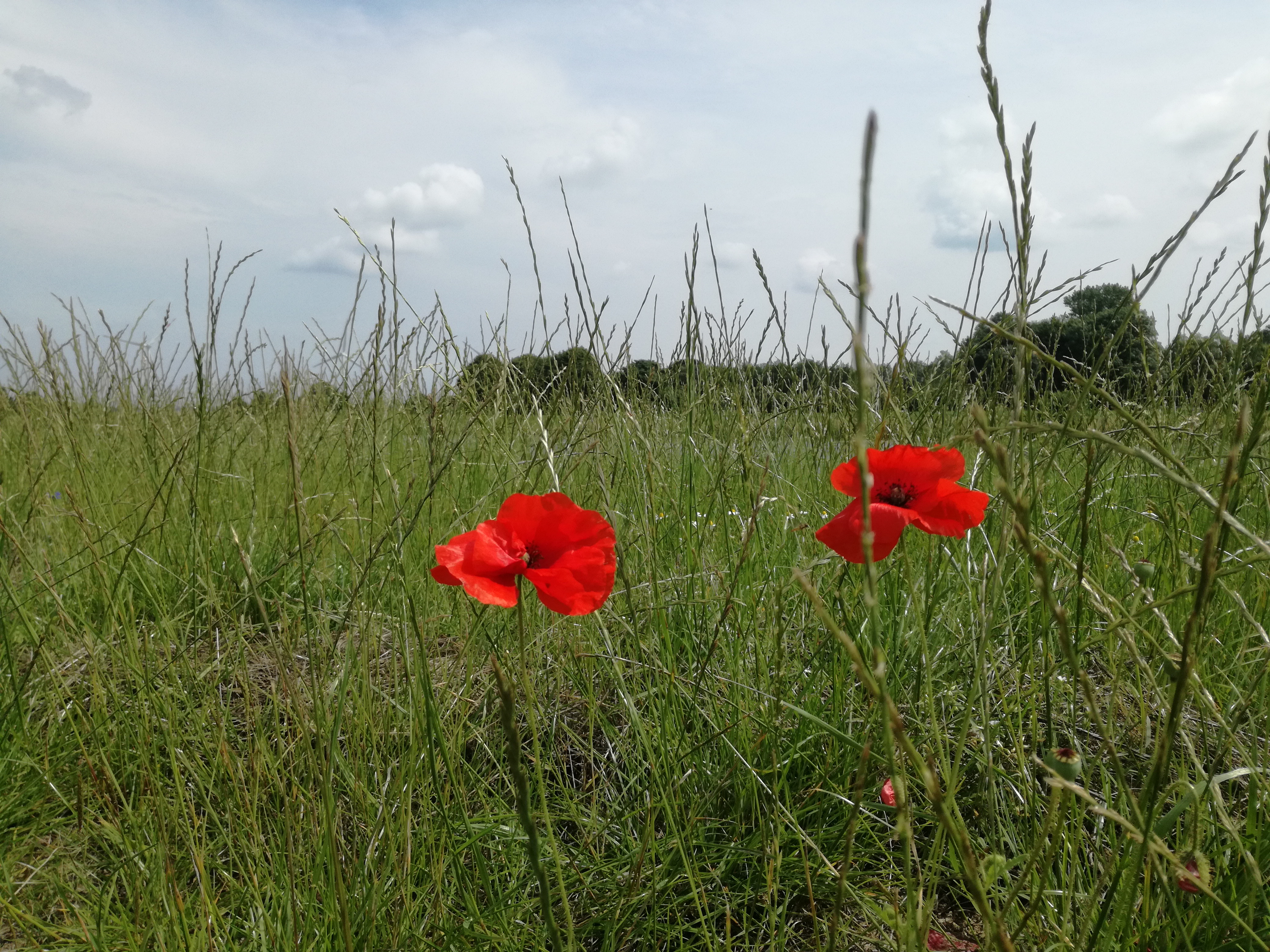 Het looptempo is niet hoog vandaag. Ik mijmer. Ik geniet van de vlinders. Zie de reiger het kanaal oversteken en bedenk dat als ie niet bewogen had ik hem nooit gezien zou hebben. Bewegen, jezelf durven laten zien, het brede water oversteken in vertrouwen dat je de overkant bereikt en daar ook een plekje is om te landen. Vogels zijn er vooral in de buurt van de bomen. Als ik echt langs de velden van de graanrepubliek wandel is er geen vogelgezang. Op de dijk langs de Dollard tref ik weer heel andere vogels aan: spreeuwen in grote groepen. Zwaluwen die me uiteindelijk waarschuwen dat er ook hier regen en onweer komt als ze laag over de grond scheren. Heel apart is een vogel die eindeloos lang hoog boven mij krijsend rondjes vliegt. Soortgenoten alarmeert en op een gegeven moment cirkelen ze met z’n zessen hoog boven mij. Tot dat ik hun territorium verlaat en zij weer hun eigen ding gaan doen.